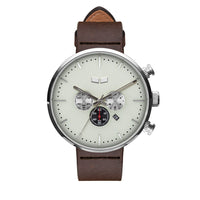The Roosevelt Chrono is a signature Vestal timepiece with its clean slim line case and straightforward dial. The premium 6-hand Japanese chronograph analog movement with date rests inside a multi-layered 42mm 316L solid stainless steel case. Laser-cut indexes then reveal a multi-layer dial that creates a unique design contrast for illuminating the hour markings. The 20mm wide premium Italian Leather Strap is integrated into the case with no lugs allowing the watch to hug your wrist and completing a clean and precise overall look and feel.